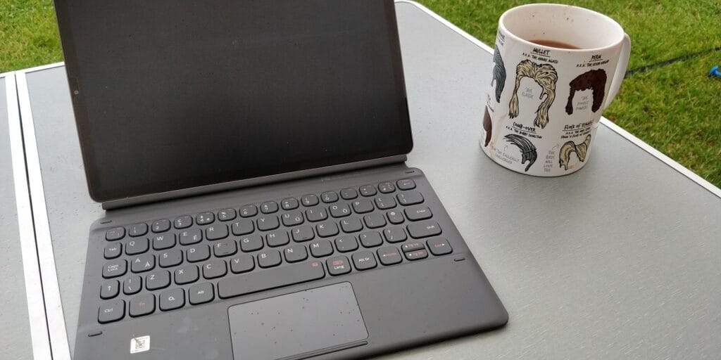 I’m sat on a tough plastic bench wearing too many layers to be comfortable, cold, typing on my tablet, tethered to my phone with whatever connectivity I can muster, on a slightly wobbly table that shifts with every keystroke. My trusty mug of hot chocolate steams next to me, and the rain seems to be easing for the moment.