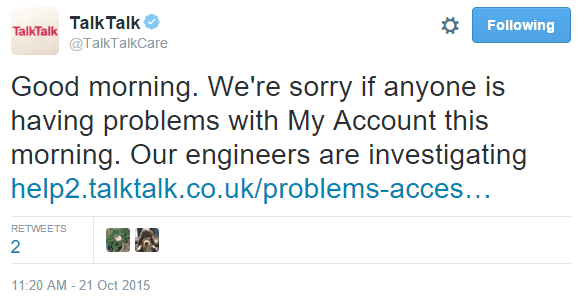 - On the morning of the 21st October Talk Talk noticed that they were having performance issues on their site. This is good news, it means that they were pro-actively monitoring the performance of their site and looking for issues.