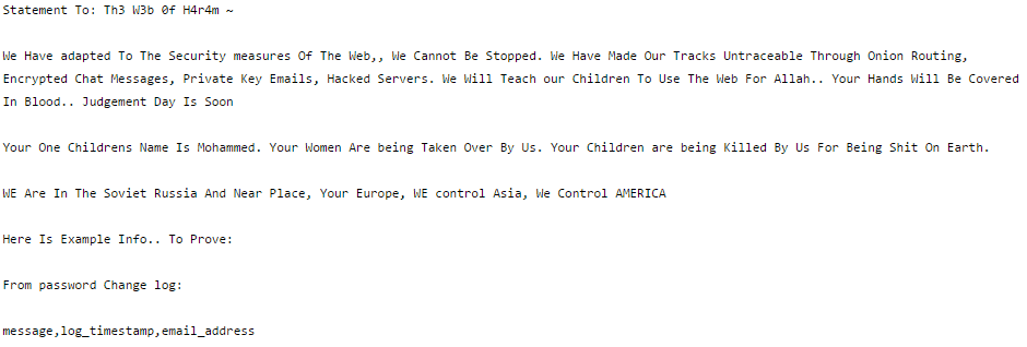 - At approximately 2am, 2 posts were made, one claiming a Russian Jihadist group had done the attack and one claiming the 64 database table names that had been taken