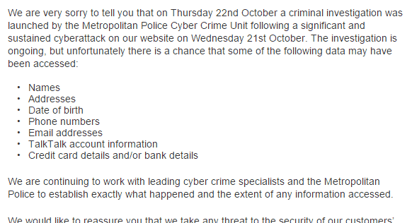 FireEye reporting having seen Talk Talk data for download on criminal websites.