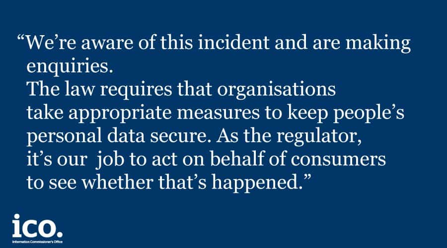 We’re aware of this incident and are making enquiries. The law requires that organisations take appropriate measures to keep people’s personal data secure. As the regulator, it’s our job to act on behalf of consumers to see whether that’s happened.”